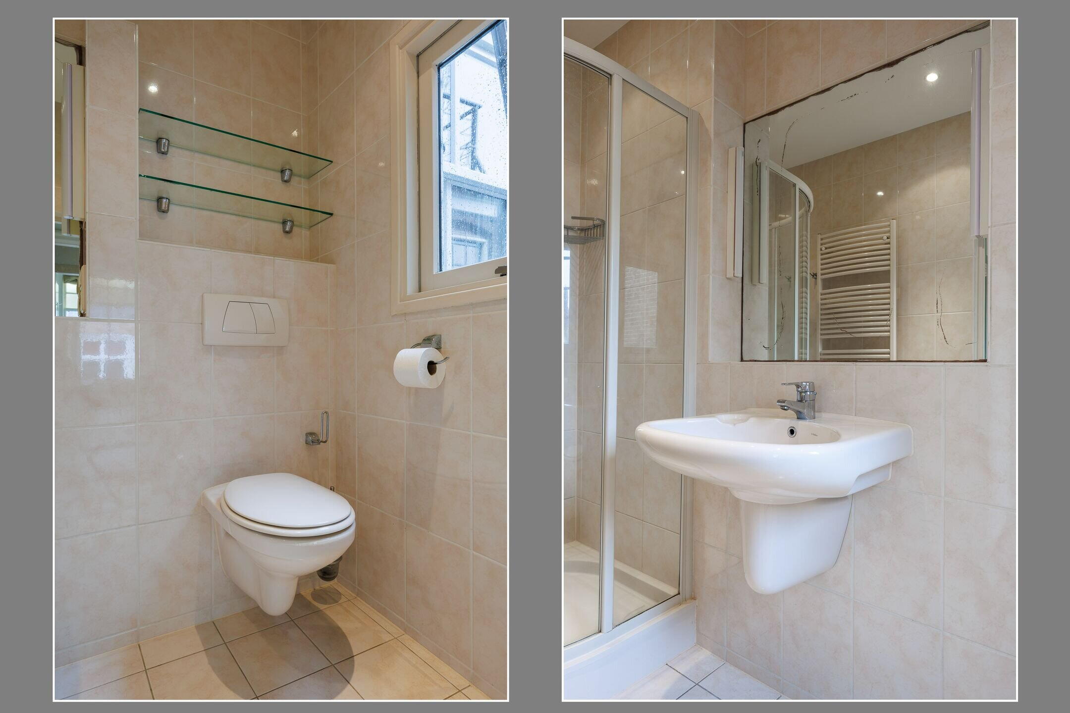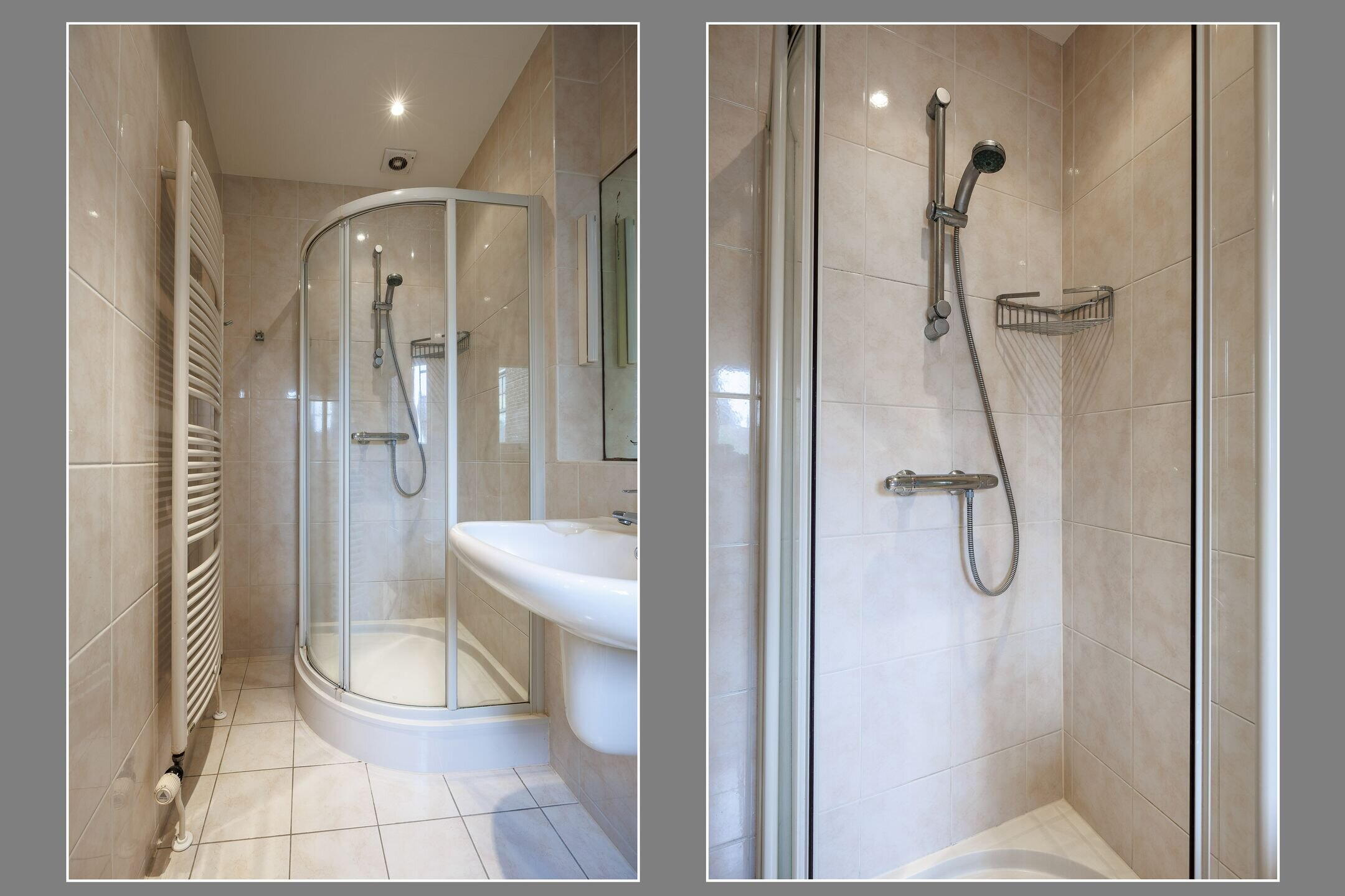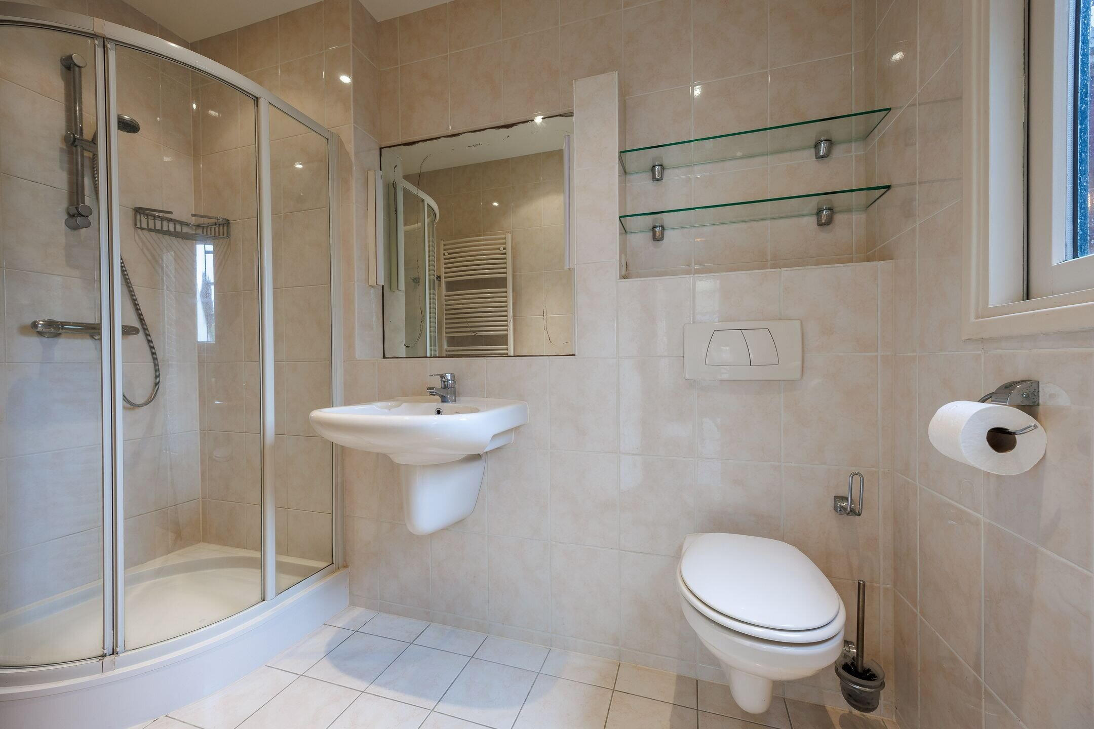 De volledig betegelde badkamer is voorzien van vloerverwarming, een douchecabine, wastafel, 2e toilet en een handdoekradiator. Door het grote raam in de badkamer komt er veel licht binnen en kan de badkamer goed geventileerd worden.