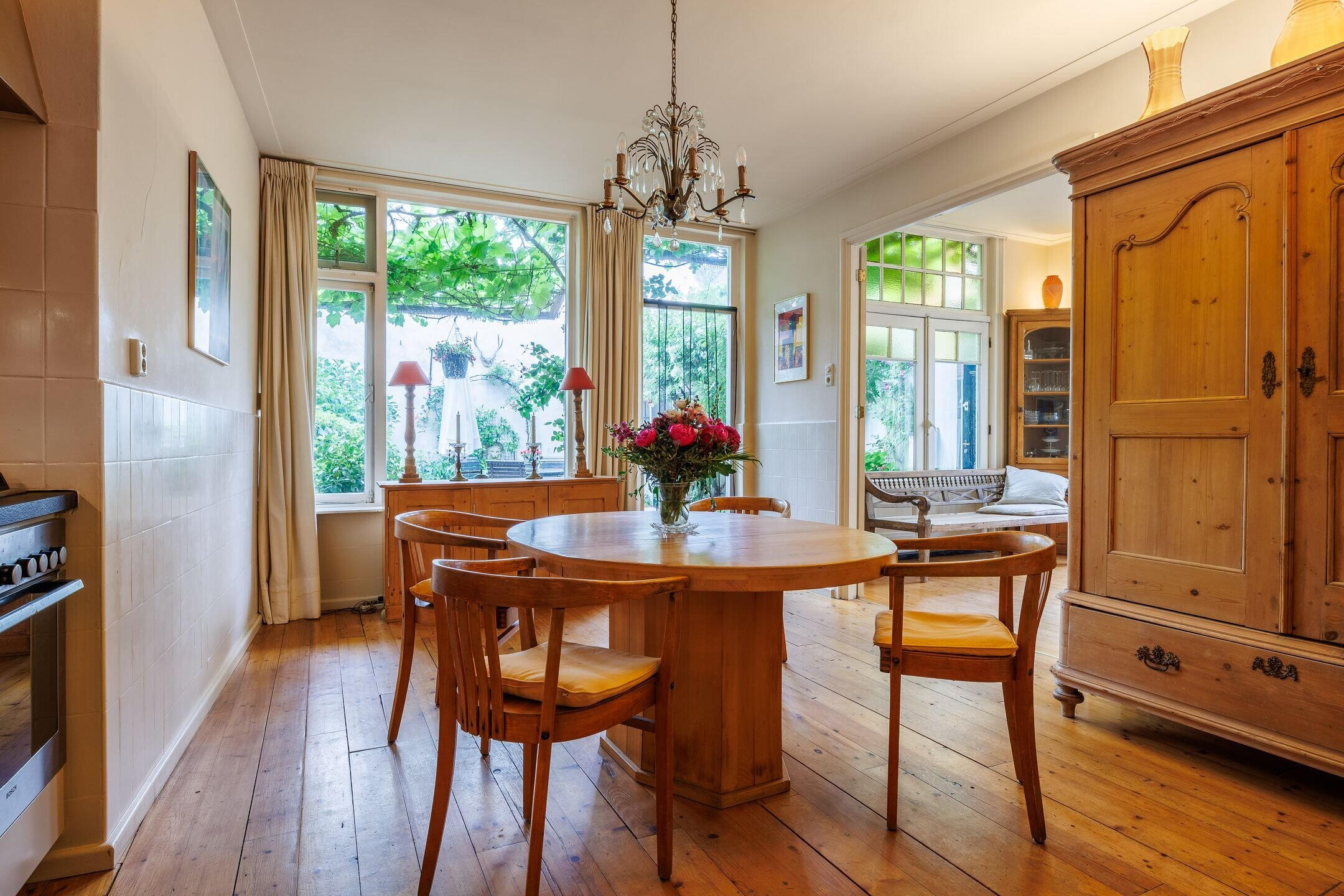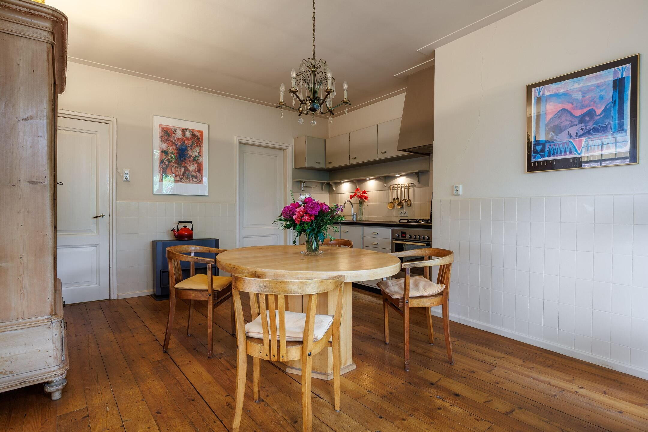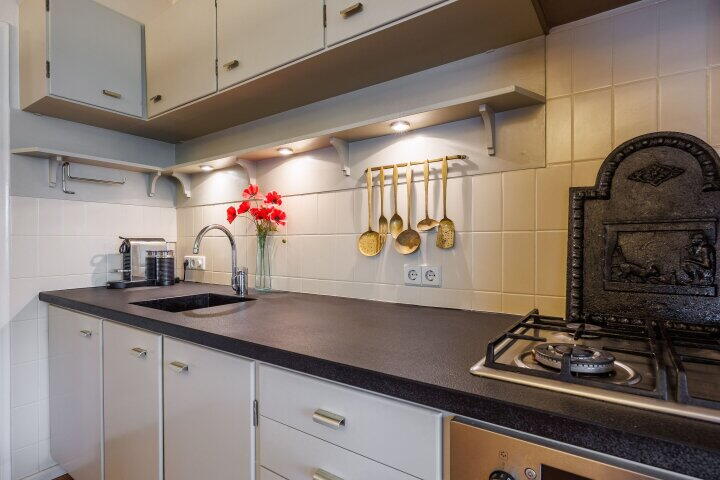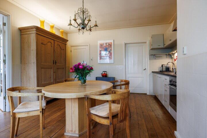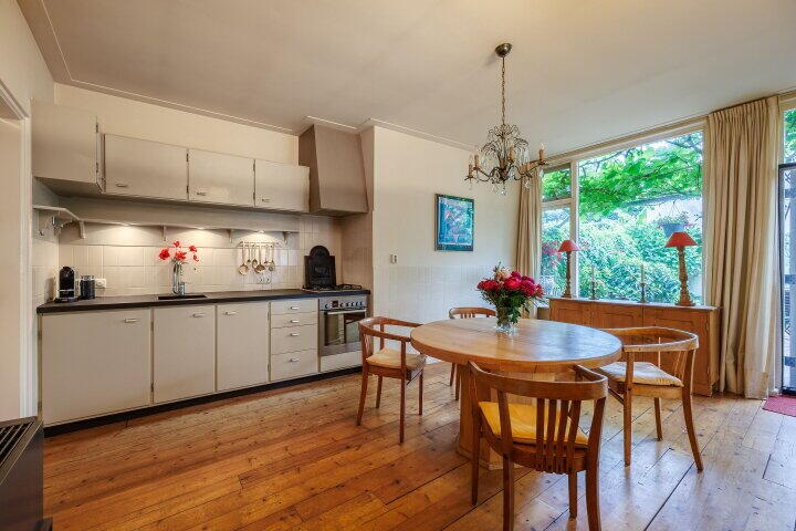 De woonkeuken is voorzien van een massief grenen houten vloer en een (deels) authentieke "Piet Zwart"-keuken, uitgevoerd met een hardstenen aanrechtblad met in- en onderbouwapparatuur. Via de woonkeuken heeft u toegang tot de bijkeuken, het toilet en de woonkamer. Zowel in de woonkeuken als in de woonkamer is er plafondisolatie aangebracht. Via het portaal, aansluitend aan de woonkeuken, heeft u toegang tot de ruime provisiekelder met opstelling voor de cv installatie.