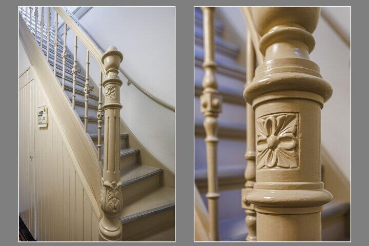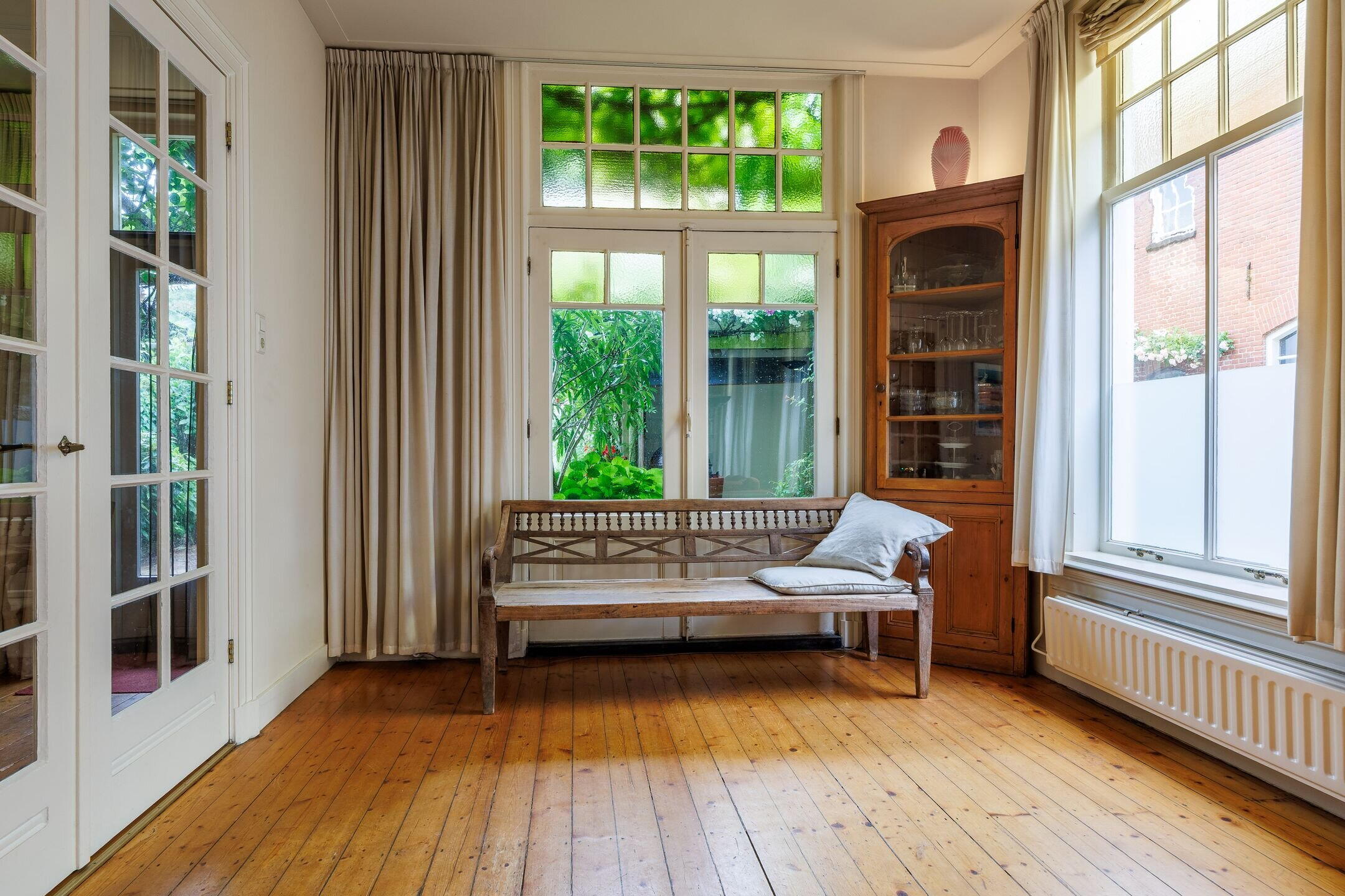 Originele bouwdetails uit begin 20e eeuw: natuurstenen plint, facetgeslepen bovenlichten, schuifvensters met boogvelden;