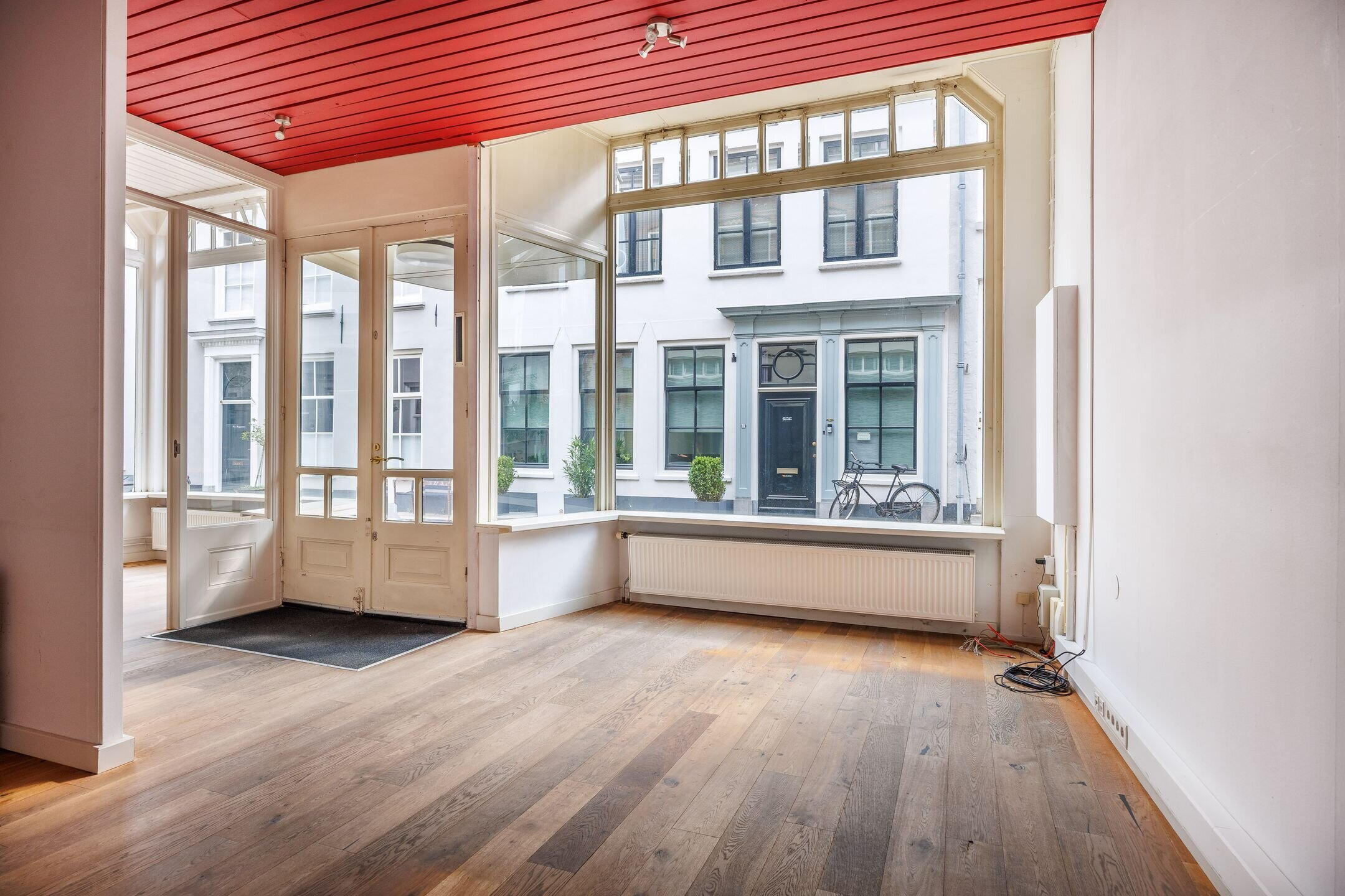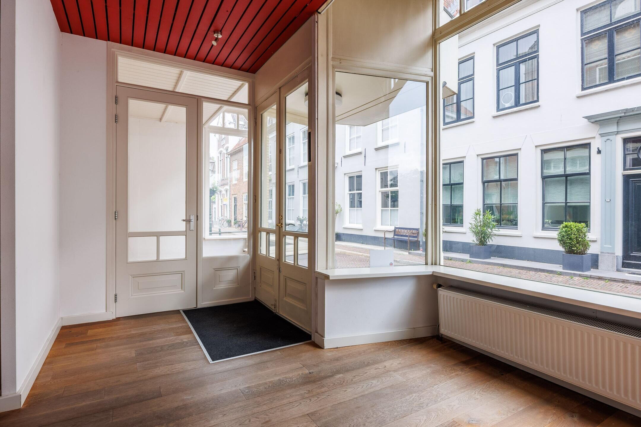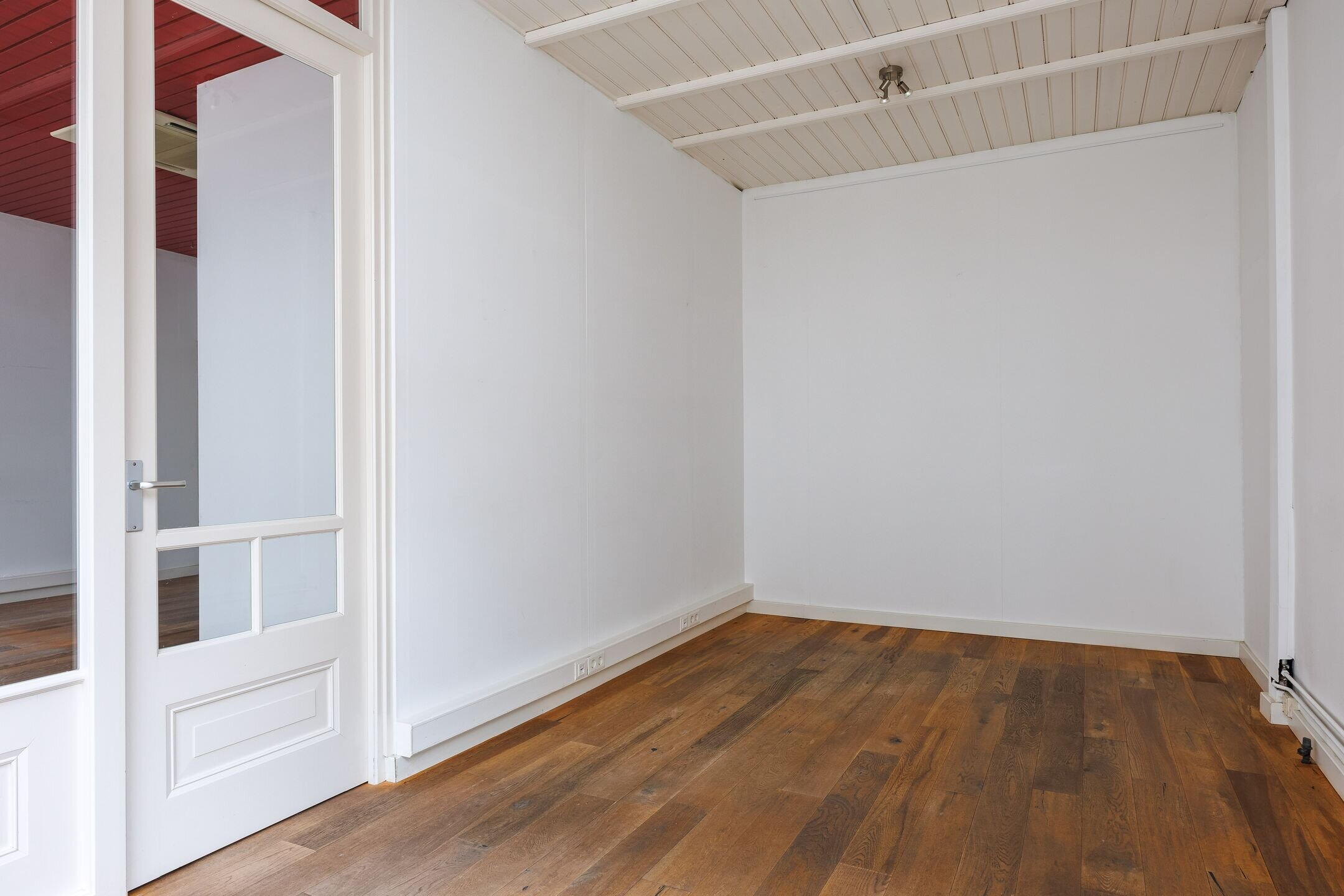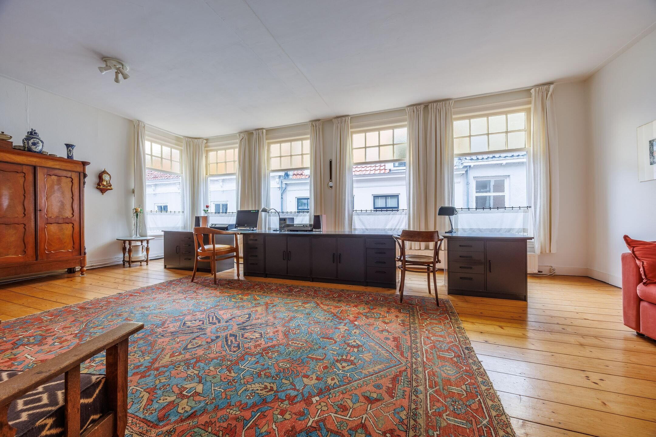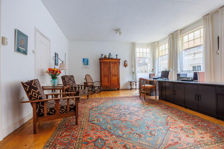 Via de woonkeuken heeft u door middel van fraaie ensuite deuren toegang tot de gezellige woonkamer met een open haard en met schuiframen met in geel glas uitgevoerde bovenlichten. Ook de vloer van de woonkamer is uitgevoerd in massief grenen. De muren in de woonkamer alsook in de achter slaapkamers zijn aan de straatzijde van binnenuit geïsoleerd. De woonkamer is eventueel en indien gewenst uit te breiden met de aangrenzende ruimte welke als voormalig kantoor werd gebruikt. Via de hal in het midden van het huis is inpandig de kantoorruimte/winkelruimte te bereiken. Een royale ruimte met veel mogelijkheden door de grote raampartij, eigen ingang, pantry en toiletruimte.
