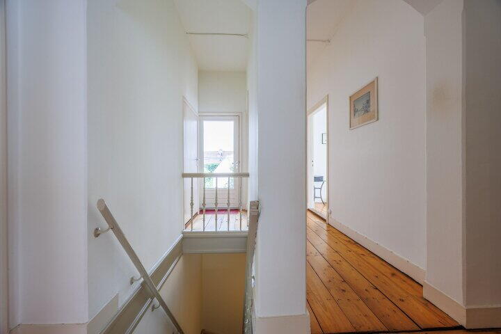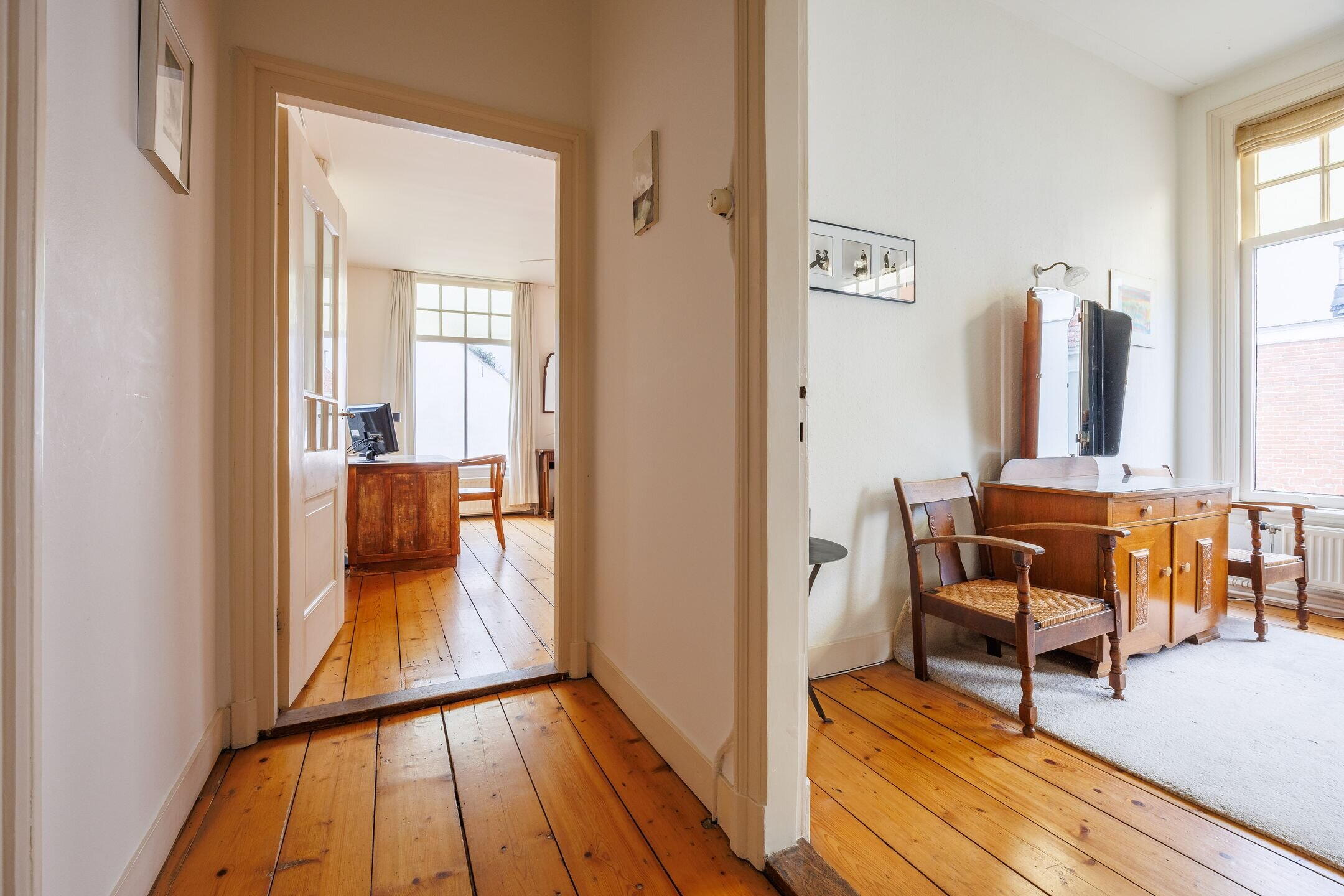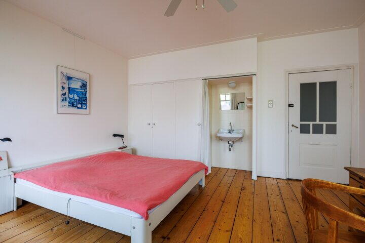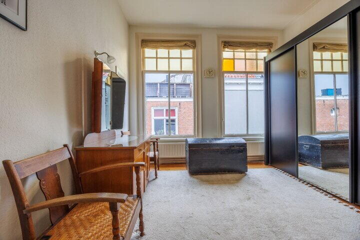 Via de vaste trap in de hal komt u op de eerste verdieping. De eerste verdieping is voorzien van een fraai portaal met balkon boven de trap die toegang biedt tot de volledig betegelde badkamer met een douche, wastafelmeubel en een 2e toilet. Aan de achterzijde van de woning treft u één slaapkamer met een vaste garderobekast en met originele schuiframen aan. De muur van de achter slaapkamers zijn aan de straatzijde van binnenuit geïsoleerd. Aan de voorzijde van de woning bevindt zich een enorme slaapkamer met 4 schuiframen en een vast zijraam. Deze slaapkamer met een oppervlak van ca. 40m² kan eenvoudig worden opgedeeld in twee ruime slaapkamers met een vaste garderobekast of kan dienen als ouderslaapkamer.